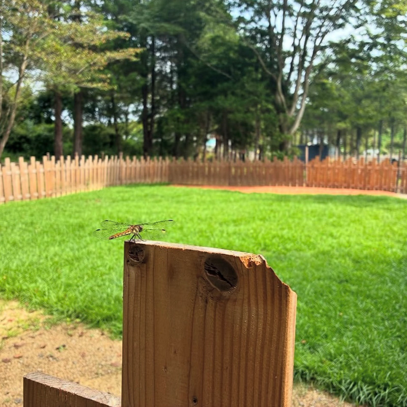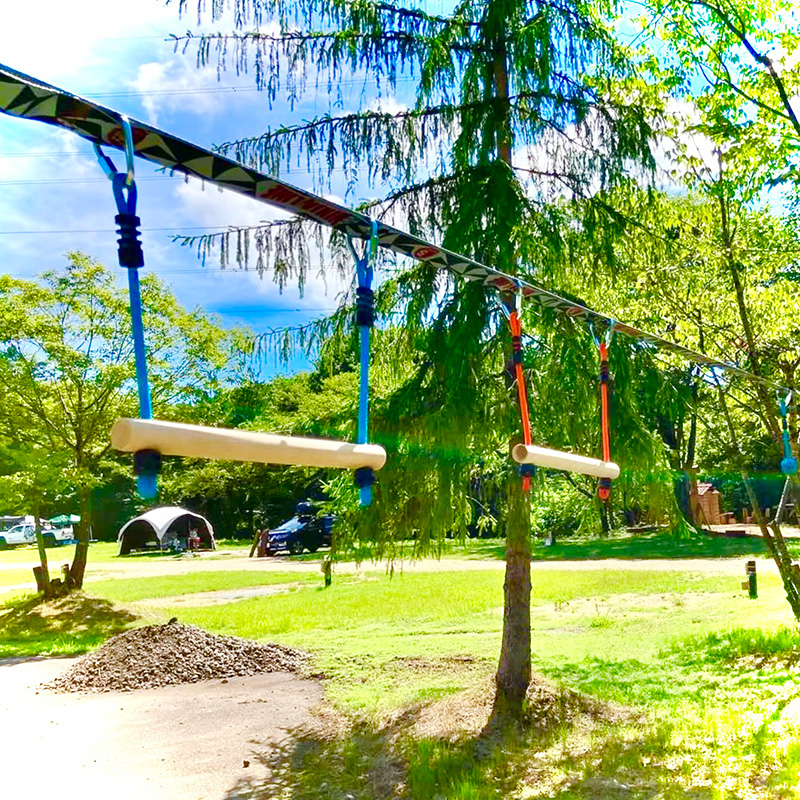 - 広いウッドデッキの向こうにはスラックライン風の遊具ニンジャラインもあります。