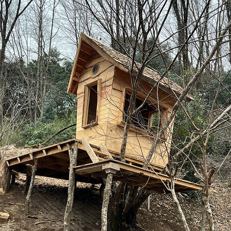 これまでに焚き火小屋、裏山工房、丸太ツリーデッキ、ツリーハウスを作る - 2024