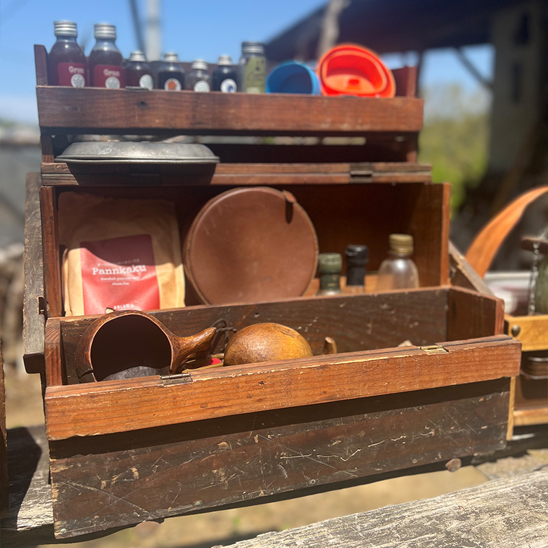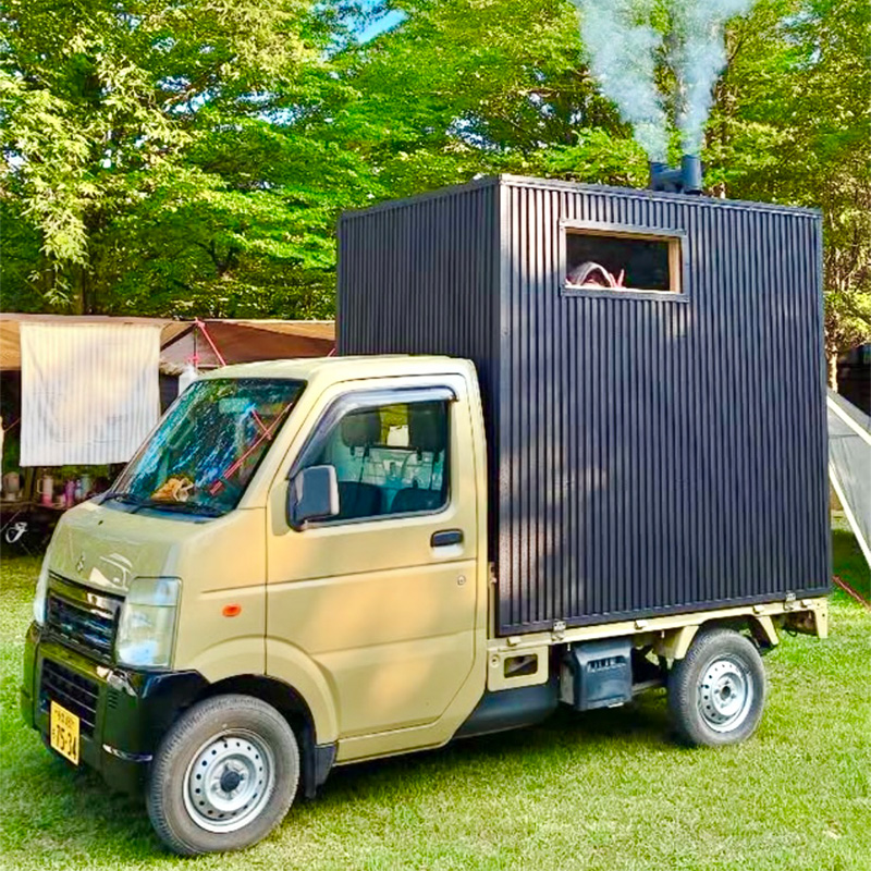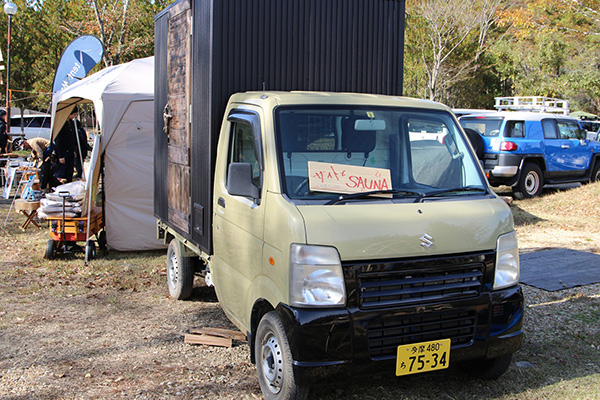 軽トラック荷台に設置した薪ストーブの本格サウナの体験ブースを出します。普段はご要望いただいたテントサイトへ移動して楽しんでもらうサウナですが、今回は長野さんの希望もあり皆さんにも体験していただくブースとして設置します。皆さん是非サウナでスッキリ暖まっていってください。