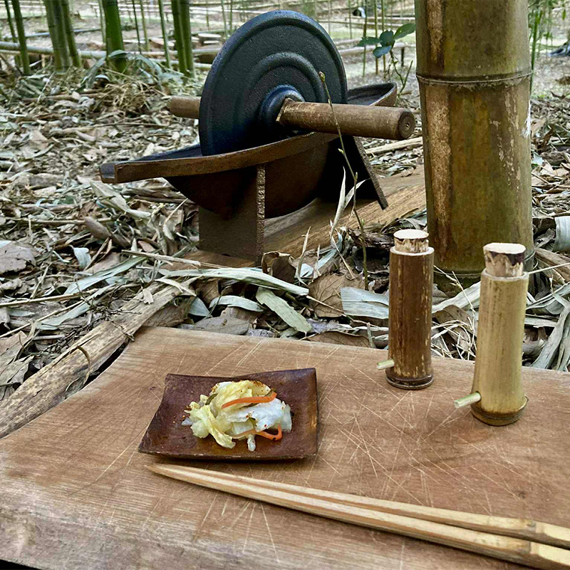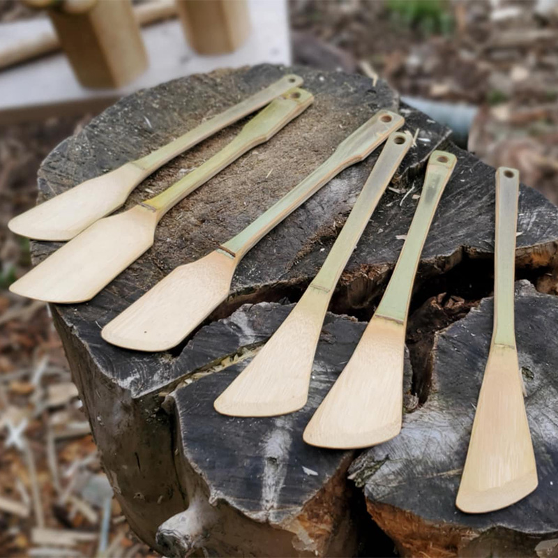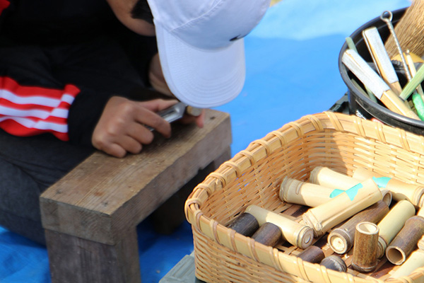 切り出した太い孟宗竹をそのまま素材にして、作れるものなら何でも製作可能。お箸、スプーン、フォーク、バターナイフ、トング、他に思いつたものや欲しかったものなど。無名庵の福山欣晃が丁寧に、そして一緒に考えて指導します。竹を使って何でも作ってみましょう。