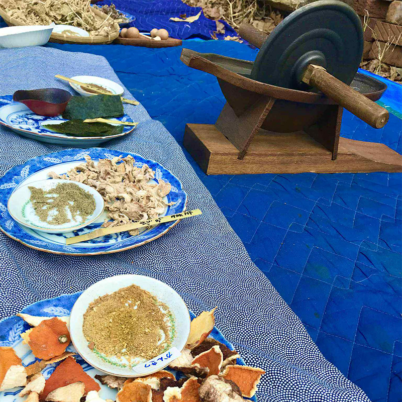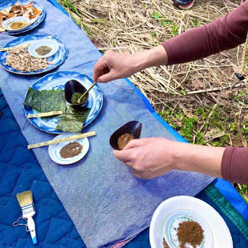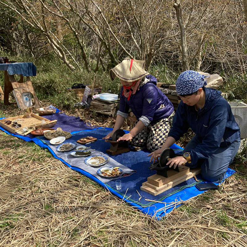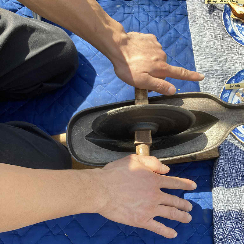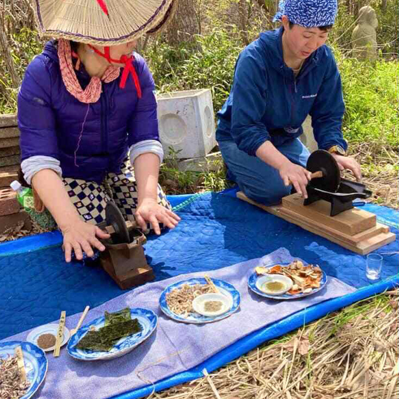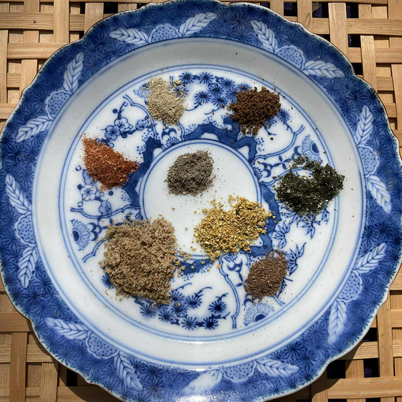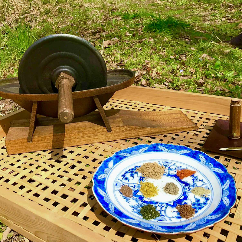 古来道具の薬研を使って七味唐辛子を作るワークショップです。研ぎたての唐辛子、白ゴマ、ミカンの皮、山椒、生姜、海苔、クロモジの葉、黒ゴマ等を自分好みの割合で混ぜ、オリジナルのmy七味をブレンドします。組み合わせによっては和ハーブ調味料も作れます。作ったmy七味は竹の七味入れ容器を作り、お持ち帰りいただけます。