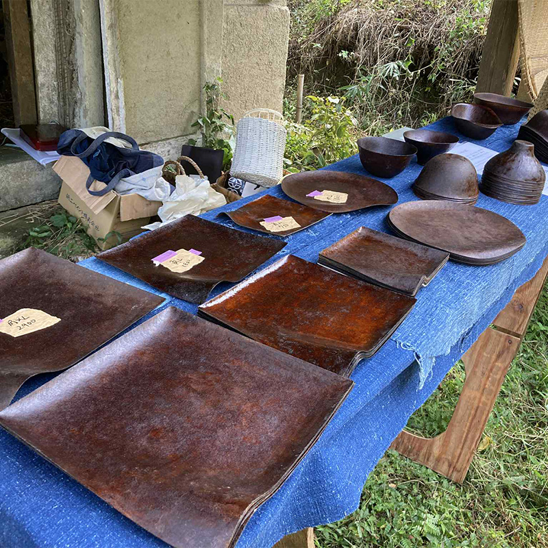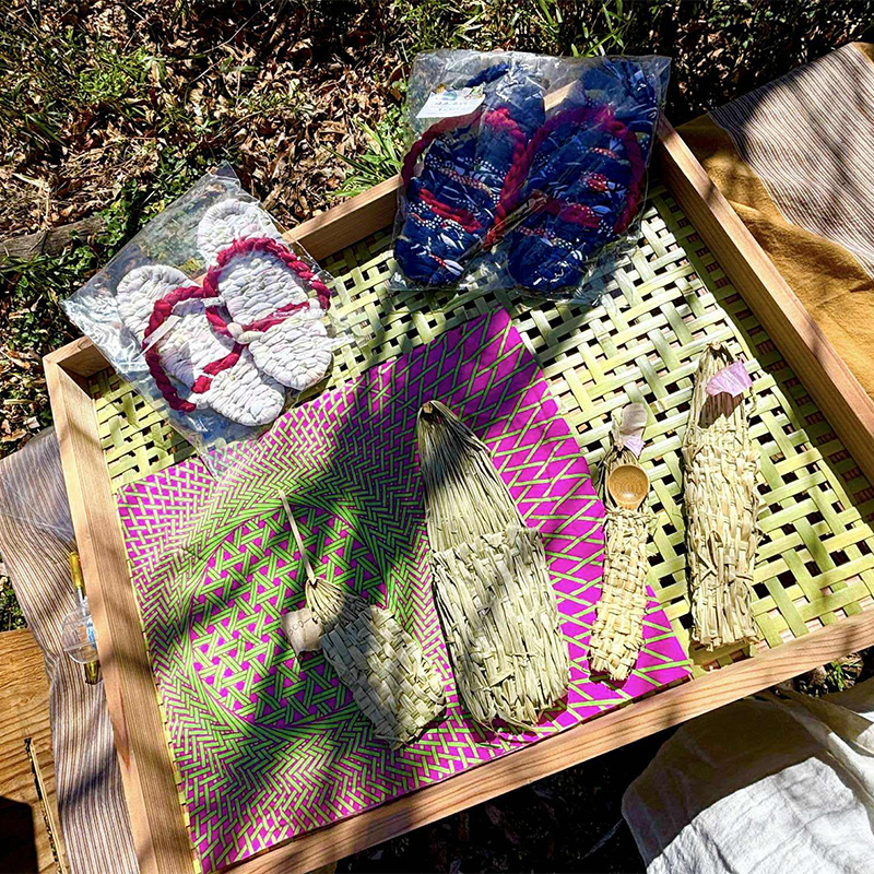 竹おかん二人の手作り作品も販売。ワークショップでは竹を使ったミニほうき作りも追加予定です。