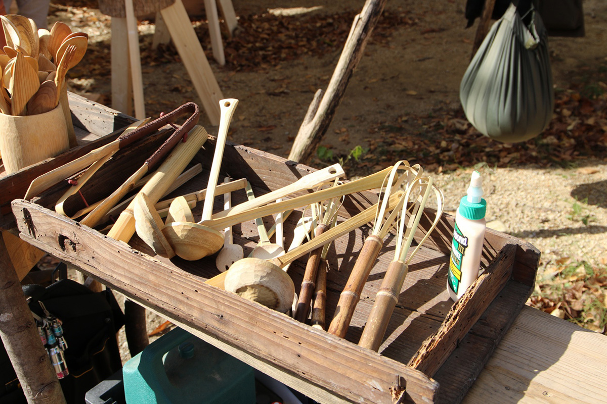 切り出した太い孟宗竹をそのまま素材にして、作れるものなら何でも製作可能。お箸、スプーン、フォーク、バターナイフ、トング、他に思いつたものや欲しかったものなど。無名庵の福山欣晃が丁寧に、そして一緒に考えて指導します。竹を使って何でも作ってみましょう。
