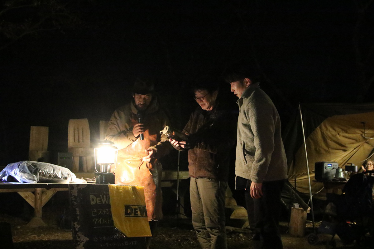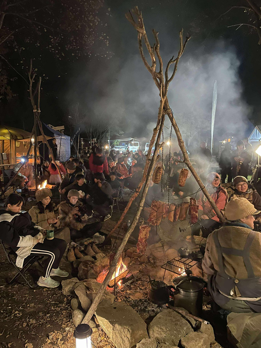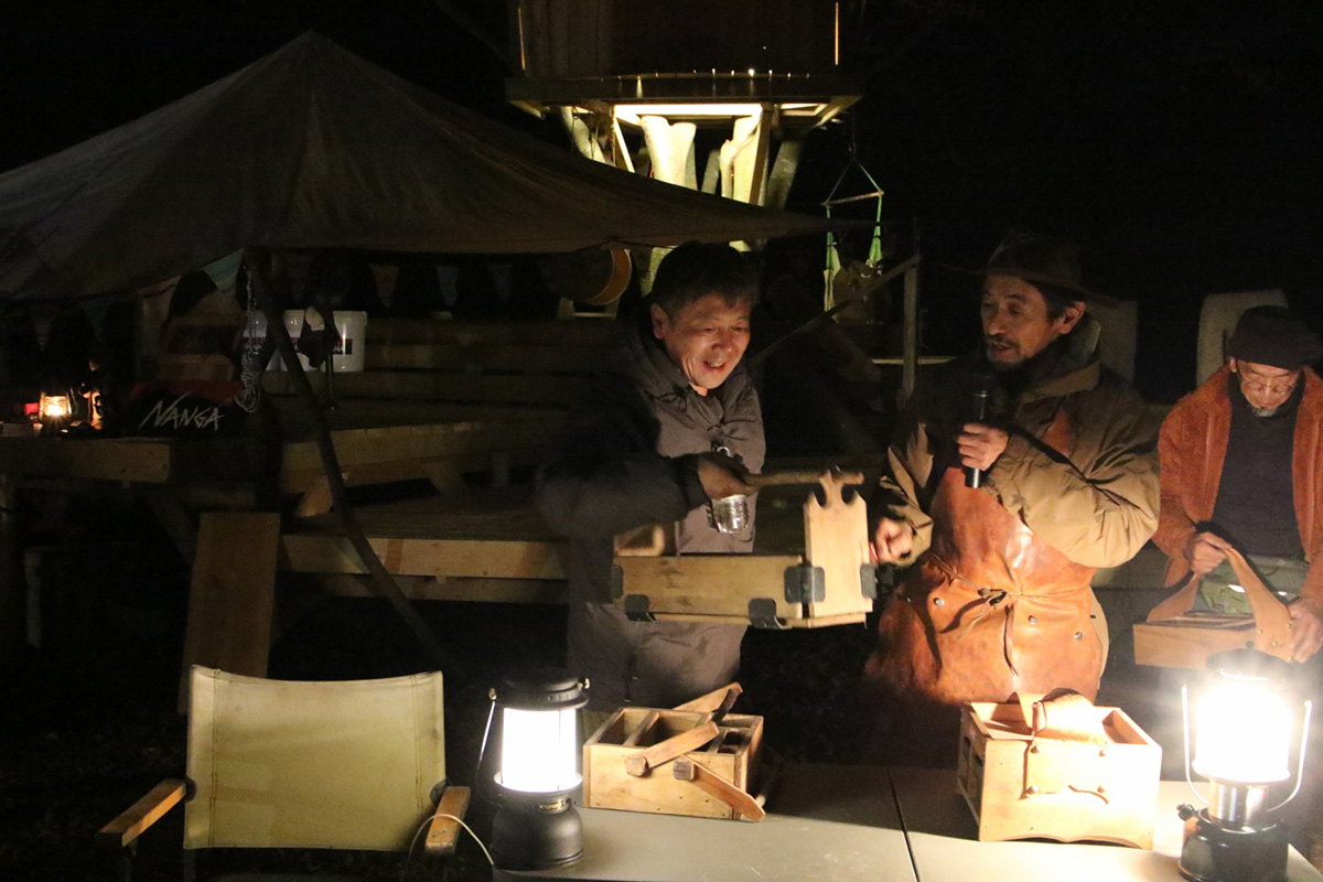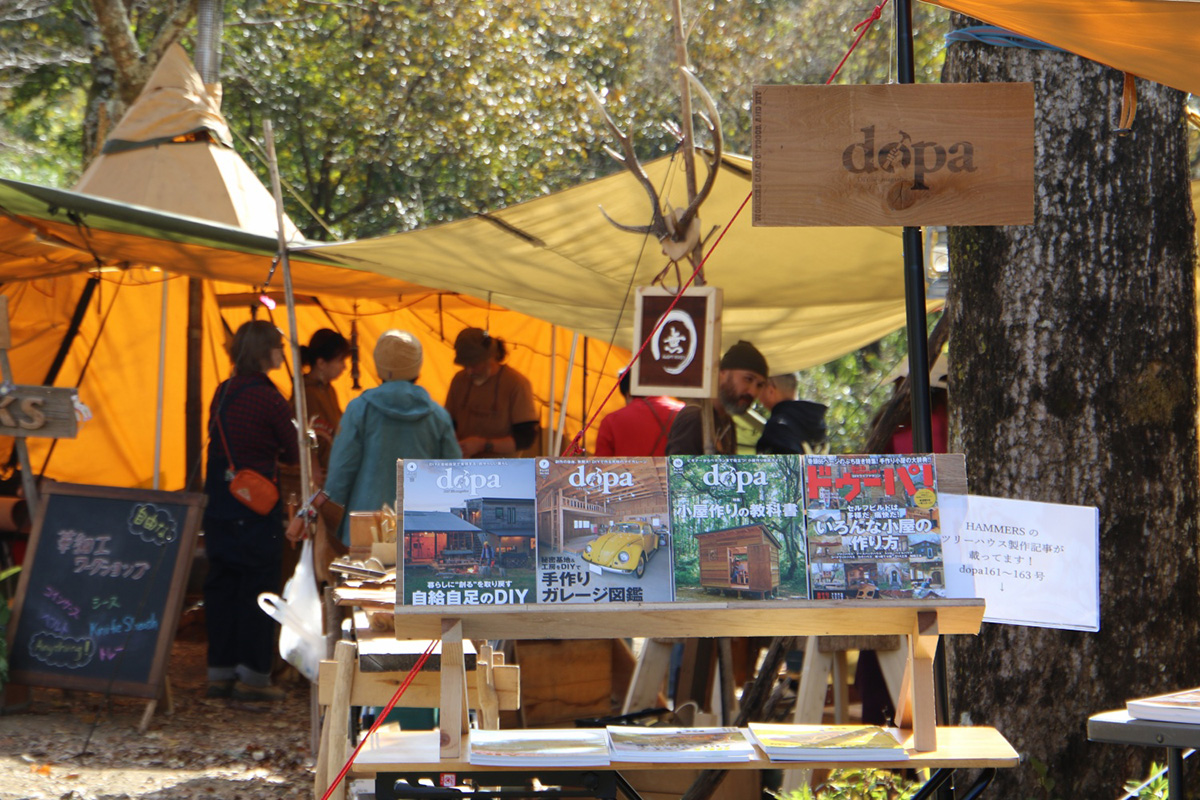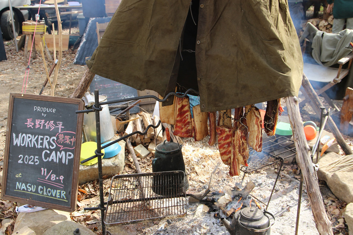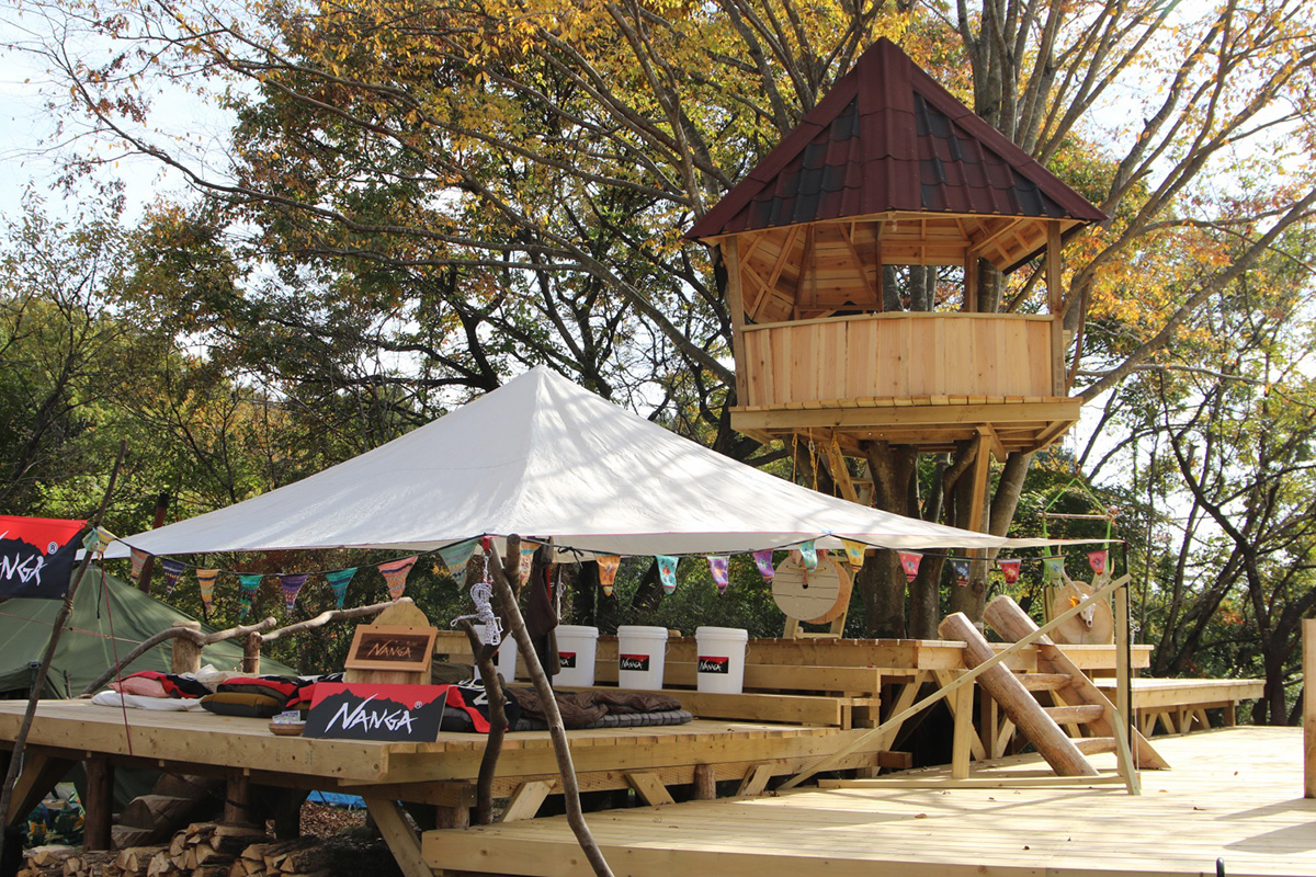 出展ブースエリアのコンテンツではナイフやノコギリなどの手工具から電動のドリルや丸ノコ、溶接機に至るまでの道具を使い、木材、自然素材、布、皮、金属等を惣菜とした体験ワークショップが出展。各種道具のメーカーブース、自走式サウナや地元フードカーもやってきます。イベントでは長野修平焚火料理をライブクッキング。定番焚火ベーコンはじめイノシシやシカのジビエベーコンも登場し、焚火にあたりながらそれらをつまみなに語らい合いましょう。 会場となるキャンプ場は今年8月にオープンしたばかりのNASU DLOVER。ここには長野修平らのBuilder unit HAMMERSが完成させたばかりのツリーデッキハウスがあり、それをメインステージとしてHAMMERSがこの1年で作った台湾の小屋や3つのツリーハウスの製作ドキュメントをメンバーのライブトークと合わせてスライド上映もします。