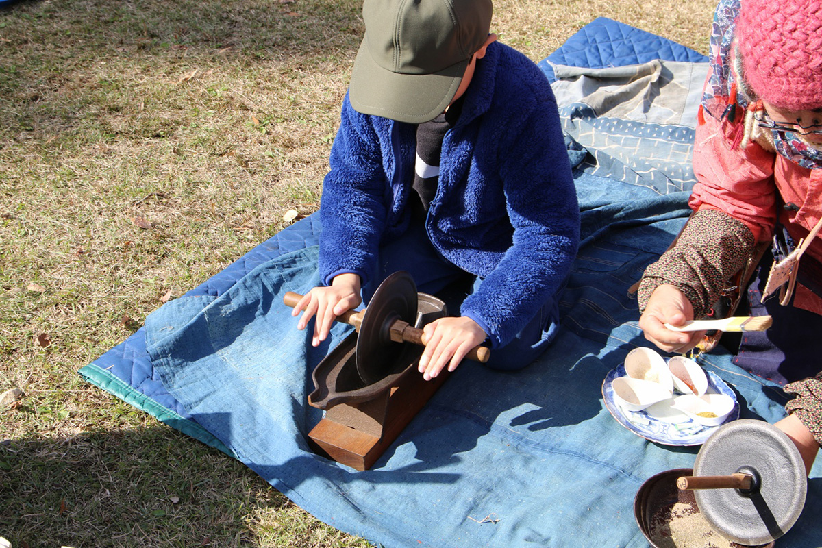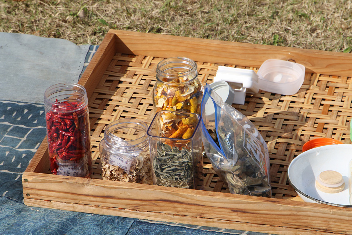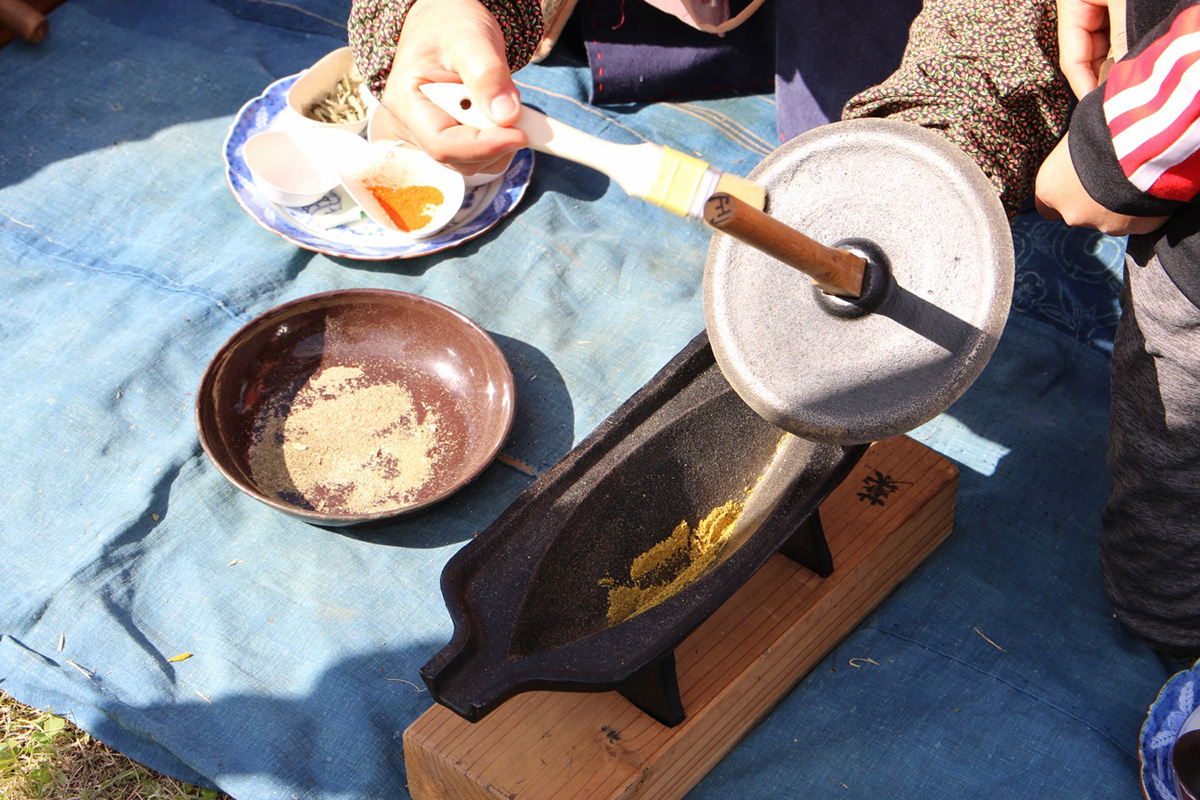 古来道具の薬研を使って七味唐辛子を作るワークショップです。研ぎたての唐辛子、白ゴマ、ミカンの皮、山椒、生姜、海苔、クロモジの葉、黒ゴマ等を自分好みの割合で混ぜ、オリジナルのmy七味をブレンドします。組み合わせによっては和ハーブ調味料も作れます。作ったmy七味は竹の七味入れ容器を作り、お持ち帰りいただけます。